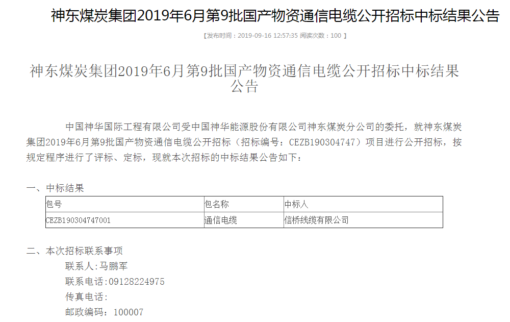 點(diǎn)擊數(shù):60062019-11-21 00:00:00 來源: 神東煤炭集團(tuán)2019年6月第9批國產(chǎn)物資通信電纜公開招標(biāo)中標(biāo)結(jié)果公告